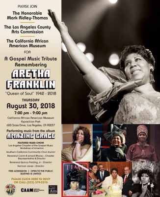 A Tribute to Aretha Franklin by a free concert, will be held in Los Angeles, California, 8-30-18, at The California African American Museum at 7pm.